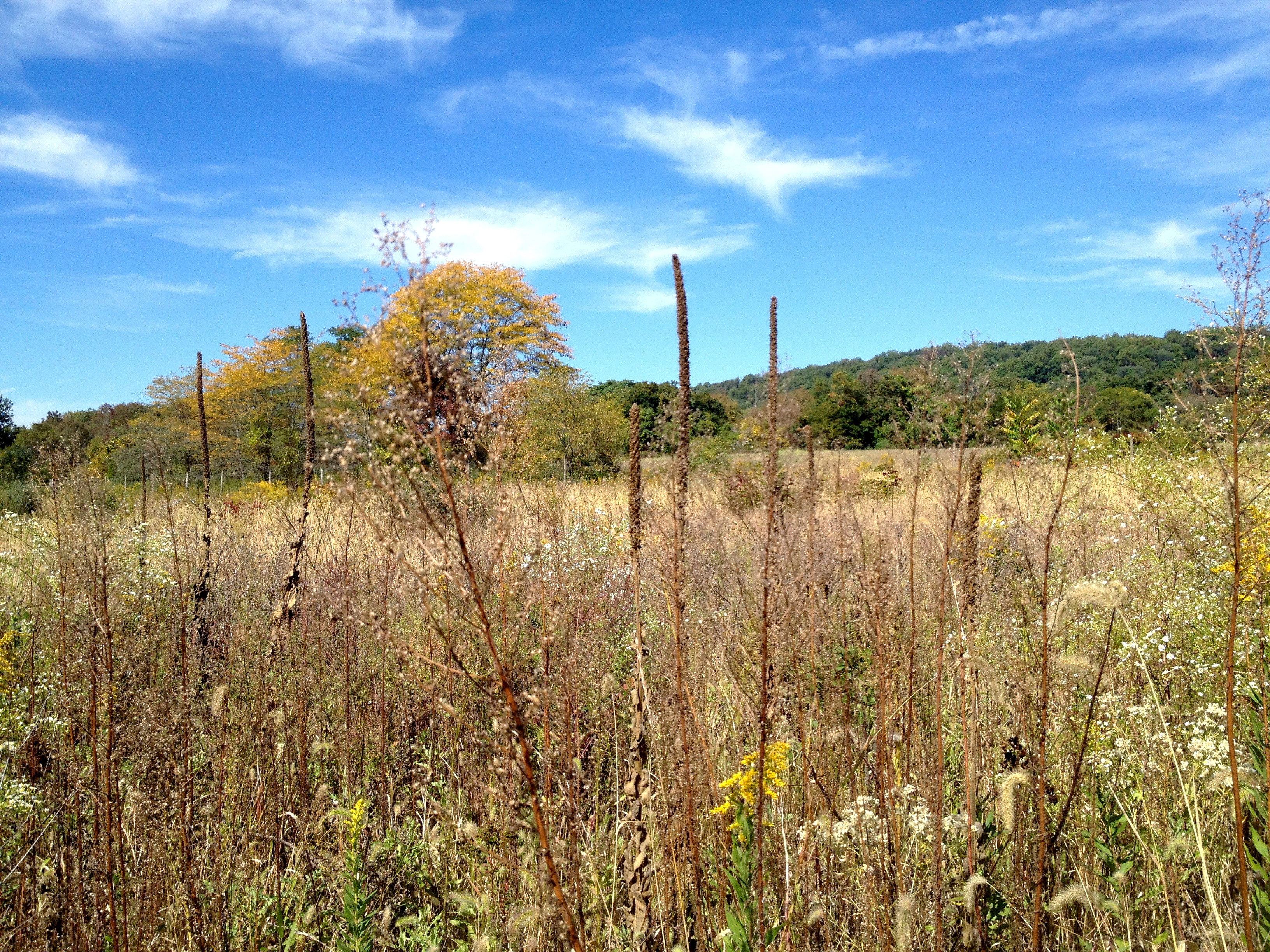 Fall is now everywhere in evidence. But a couple weeks ago, on the most recent decent walk I’ve had, its signs were only visible once we’d left the road. The trees, except for a few walnuts, still had all their leaves, and most of them were still green. The grasses and brush in the fields were not. They seem to have to have their life burnt out in an instant just before, which my wife confirmed: “It was all green a couple days ago!” The stalks and leaves were crisp, but despite their look were not disintegrating into ash at the touch. The mullein stalks though having gone completely brown had lost none of their substantial appearance.